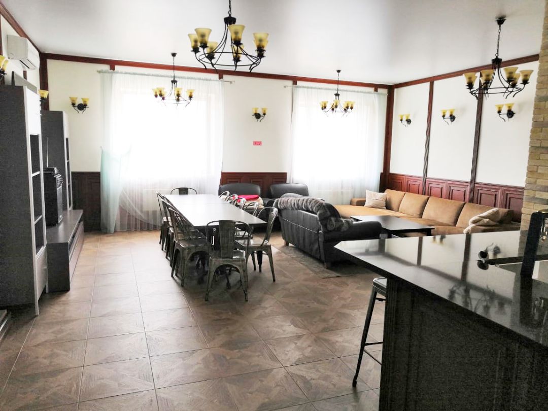 На первом этаже располагается просторная кухня и столовая, зонированная гостинная с барной стойкой, обустроены сауна и комната отдыха.